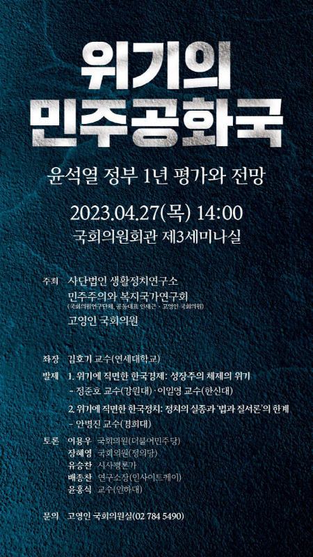 고영인 국회의원(더불어민주당, 경기 안산 단원갑)은 4월 27(목) 오후 2시 제 3세미나실에서, 사단법인 (사)생활정치연구소(이사장 : 김준묵)와 국회의원연구단체 민주주의와 복지국가연구회(공동대표 인재근‧고영인)와 공동으로 <위기의 민주공화국 : 윤석열 정부 1년 평가와 전망> 주제로 국회 토론회를 개최한다고 밝혔다.