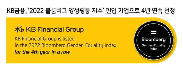 | ▲ KB금융그룹 ‘2022 블룸버그 양성평등 지수’ 편입 기업으로 4년 연속 선정(사진=KB금융그룹) |