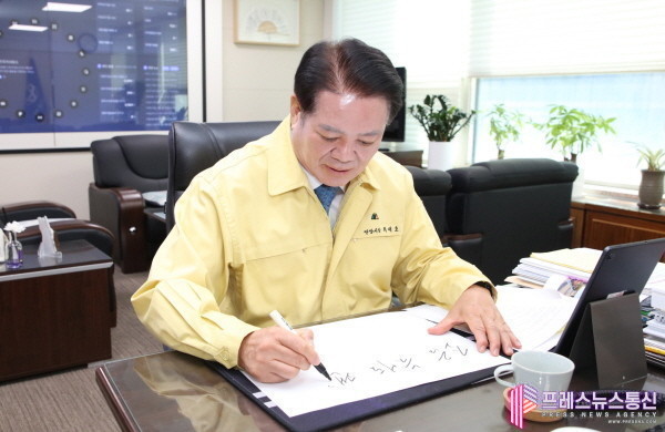 ▲최대호 안양시장이 11일 오전 집무실에서 폭염 속 일하는 이동노동자의 안전을 위한 캠페인을 펼치고 있다.(사진=안양시) |