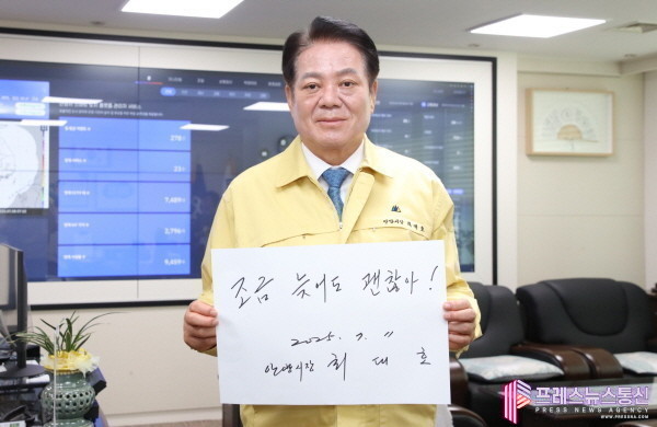 안양시는 최 시장이 11일 오전 9시40분경 집무실에서 ‘조금 늦어도 괜찮아!’라는 문구를 자필로 작성하며 폭염 속에서 묵묵히 일하고 있는 집배원・택배기사・배달 노동자 등에 대해 감사와 존경의 마음을 전했다고 밝혔다.