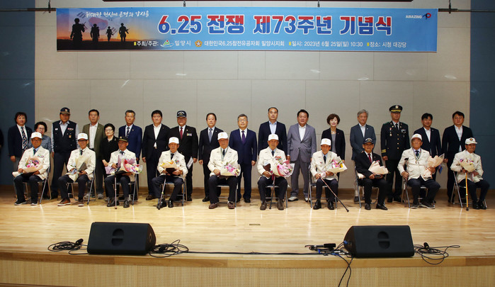 ▲밀양시청 대강당에서 개최된 6.25전쟁 제73주년 기념식에서 참전유공자들과 참석내빈들이 기념촬영을 하고 있다.(사진=밀양시) |