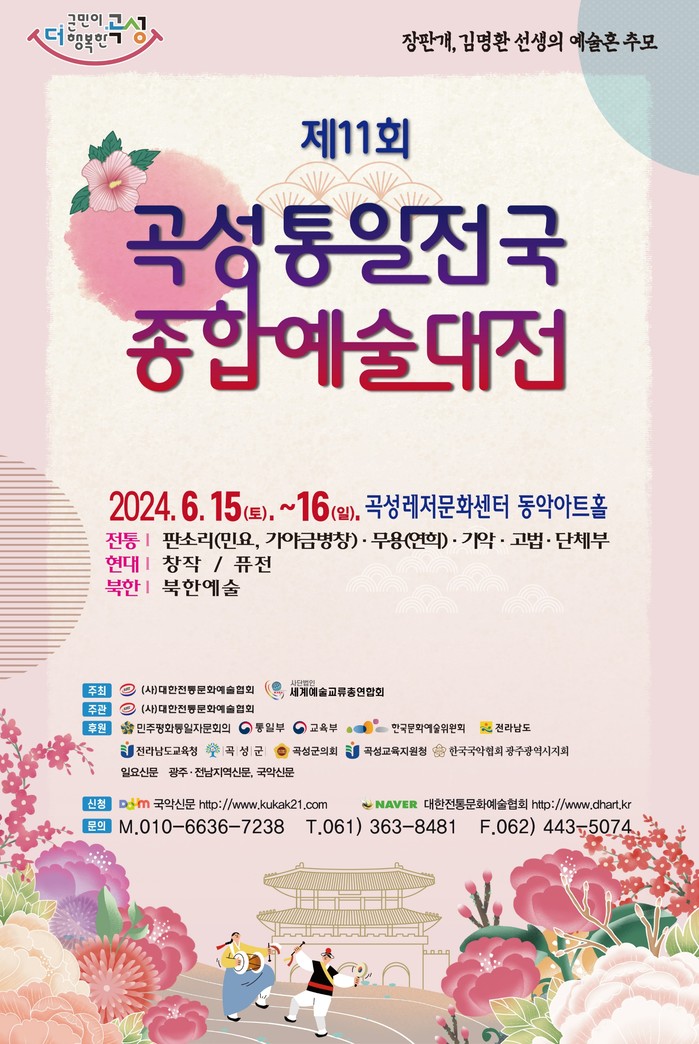 군 관계자는 “곡성통일전국종합예술대전은 우리 군의 자랑인 판소리 명창 장판개 선생과 고수 김명환 선생의 예술혼을 추모하고 통일문화예술의 비전을 확인하는 데 목적이 있다”며 “이번 행사를 통해 곡성군의 문화예술 브랜드 가치를 높이는 좋은 계기가 되기를 기대한다”고 말했다.