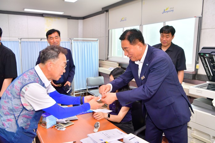▲민생회복 소비쿠폰 지급 첫날인 21일 김한종 장성군수가 장성읍 행정복지센터를 찾았다.(사진제공=장성군) |