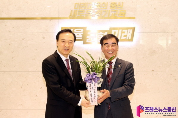 염 의장은 임 교육감에게 도교육청의 광교 청사이전 축하인사를 전하며, 1층 로비의 독서공간 등의 대민문화공간과 교육감 집무실 등 주요시설을 둘러봤다.