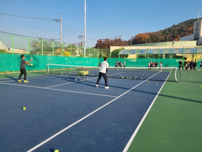 이날 선수들은 테니스 종목을 쉽게 이해할 수 있도록 테니스 기초이론 및 종목에 대한 이론교육을 진행하고 기본동작, 연습경기 등 수업을 진행했다.