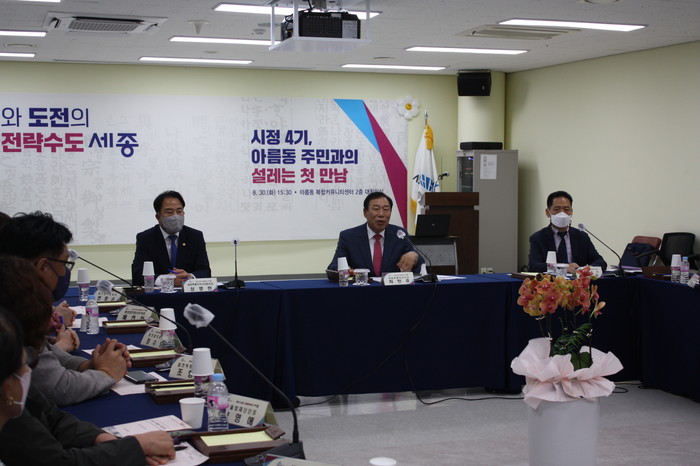 [프레스뉴스] 김교연 기자=최민호 세종시장이 시민들과 소통하고 지역 현안을 직접 챙기기 위해 30일 아름동 복컴을 찾아 참가한 주민 대표들의 건의사항을 청취했다.