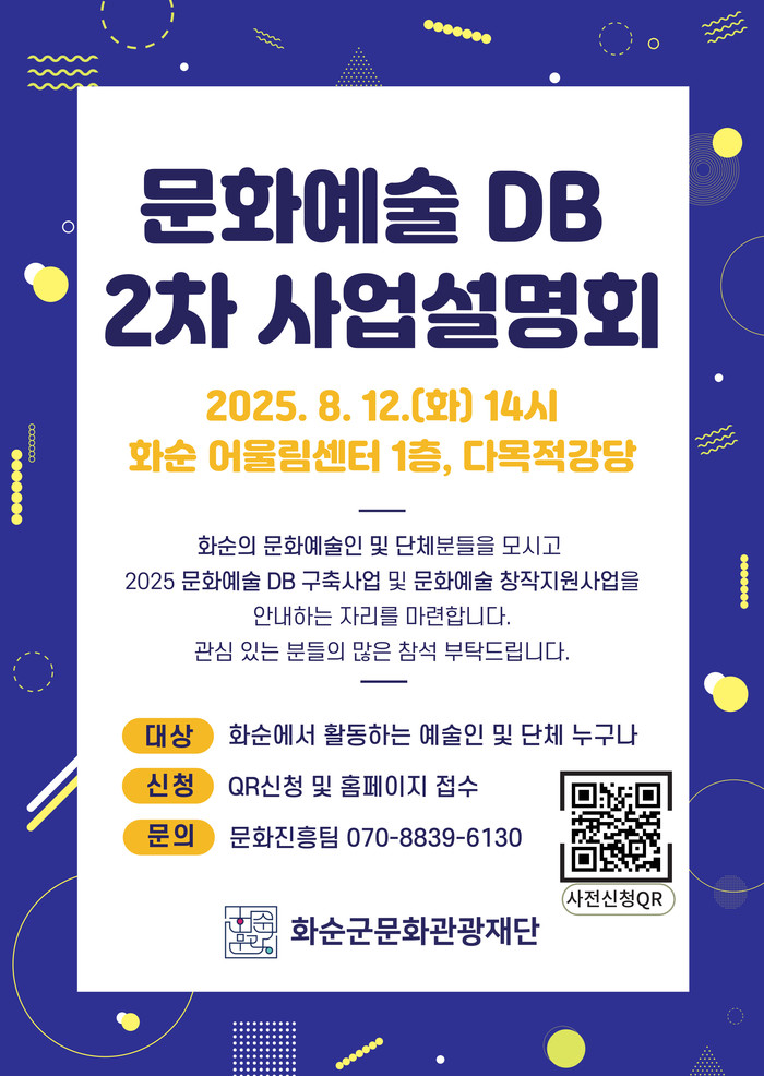 이번 2차 설명회는 더욱 폭넓은 예술인의 참여를 독려하기 위해 마련되었으며, 문화예술인 DB 구축 현황 및 향후 계획, 그리고 ‘2025 문화예술 창작지원사업’의 주요 내용이 함께 소개될 예정이다.