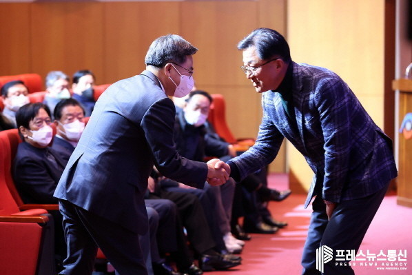 | ▲14일 경기도 수원시 권선구 경기종합노동복지회관 3층에서 열린 한국노총 경기지역본부 2022년 경기노동가족 송년의 밤 행사에서 김동연 경기도지사가 김연풍 한국노총 경기지역본부 의장과 악수하며 인사하고 있다.(사진=경기도) |