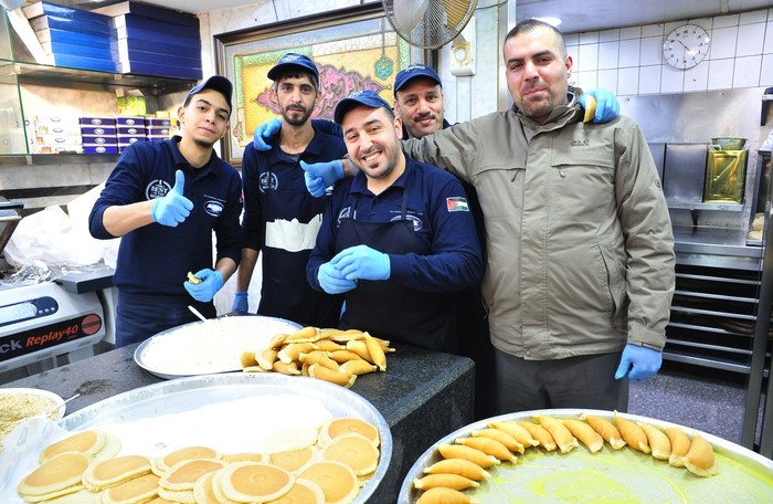 [프레스뉴스] 채정병 특파원=12일(현지시간) 요르단 암만의 한 과자점에서 점원들이 라마단 대표 디저트인 까따이프를 만들면서 포즈를 취하고 있다. 중동의 전통 후식인 까따이프는 만두피 만한 크기의 팬케이크에 견과류나 치즈 등을 넣고 튀긴 후 시럽을 뿌려서 먹는다.
