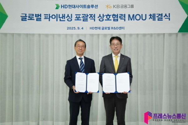 [프레스뉴스] 류현주 기자= KB금융그룹(회장 양종희)은 지난 4일, HD현대 글로벌R&D센터에서 HD현대사이트솔루션(대표 조영철)과 해외 건설기계 시장을 겨냥한 금융지원 협업 모델을 구축하기 위해 ‘글로벌 파이낸싱 포괄적 상호협력 업무협약(MOU)’을 체결했다.