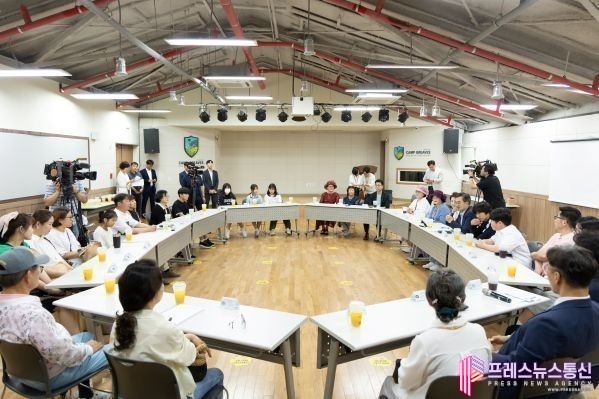 ▲9일 오후 캠프그리브스 DMZ체험관에서 김동연 경기도지사가 대성동 이장, 주민자치회 부회장, 대성초 졸업생 등과 함께 차담회를 하고 있다.(사진=경기도) |