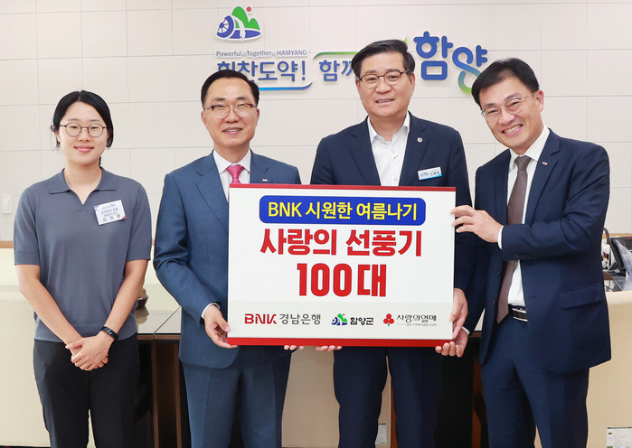 이날 김우현 경남은행 함양지점장 및 이일환 상무는 진병영 함양군수에게 나눔 물품을 전달하며 “소외된 이웃들이 폭염을 대비하는데 조금이나마 도움이 되길 바란다”며 “앞으로도 다양한 사회공헌사업을 통해 이웃사랑실천에 동참하도록 하겠다”고 말했다.