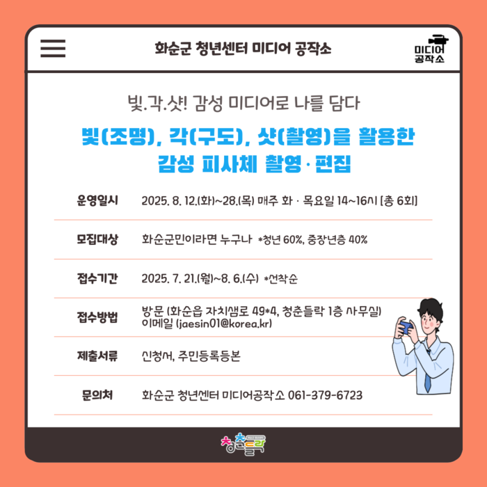 [전남=프레스뉴스] 박정철 기자=화순군(군수 구복규)은 오는 8월12일 오후 2시 화순군 청년센터(청춘들락) 미디어공작소에서 군민을 대상으로 조명과 구도를 활용한 나만의 감성을 미디어로 담는 교육을 진행한다고 밝혔다.
