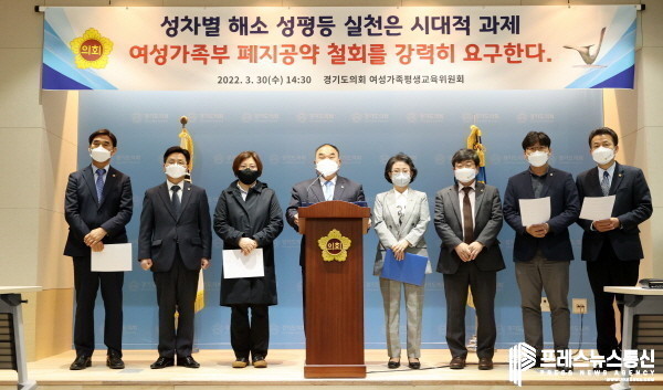 [프레스뉴스] 김대일 기자= 경기도의회 여성가족평생교육위원회는 제358회 임시회 제2차 상임위 심사에 ‘여성가족부 폐지 공약 철회 촉구 결의안’을 위원회 안으로 채택 가결하고, 기자회견(도의회 브리핑룸)을 통해 여성가족부 폐지 공약 철회를 촉구하는 성명을 발표하였다.