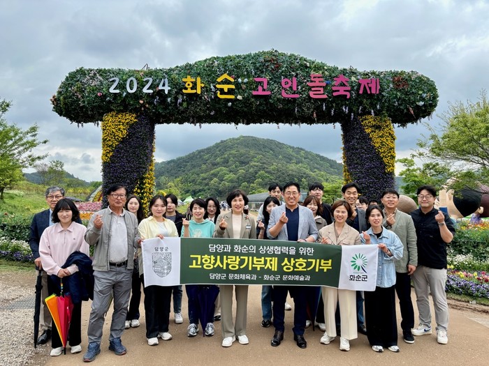 이날 담양군 문화체육과 직원들은 화순군 문화예술과 직원과 함께 화순군에서 열린 고인돌 봄꽃 축제장을 방문해 서로의 지자체에 기부하고 지역의 특산품도 홍보하며 상호 협력을 약속했다.