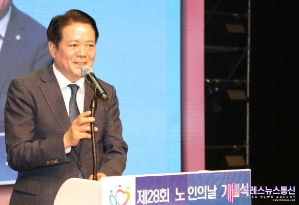 | ▲최대호 안양시장이 2일 안양아트센터 관악홀에서 열린 제28회 노인의 날 기념식 및 실버문화축제에서 기념사를 하고 있다.(사진=안양시) |