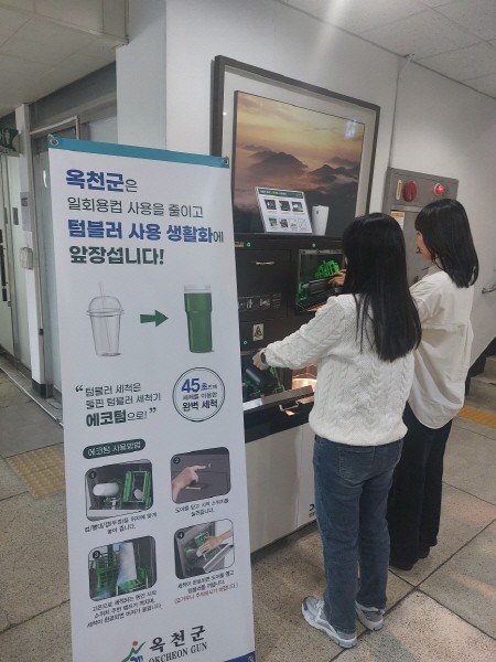| ▲텀블러 세척기 이용 모습(사진=옥천군) |