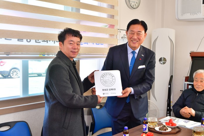 | ▲김한종 장성군수(우)가 금계1리 우수 마을 현판을 전달하고 있다.(사진제공=장성군) |