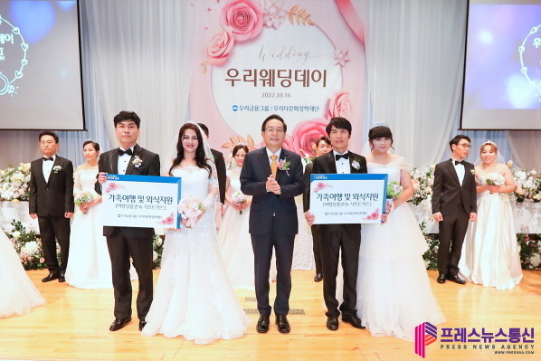 특히, 손태승 이사장은 결혼식을 마치고 10쌍의 커플들을 위해 개별로 사진촬영을 했고, 신혼여행 상품권과 가족외식상품권을 직접 전달했다. 이어 피로연장에 참석해 결혼식이 끝날때까지 오찬을 함께하며 축하의 마음도 나누었다.