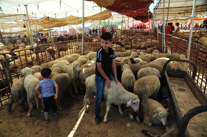 [프레스뉴스] 채정병 특파원=9일(현지시간) 이슬람권 최대 명절인 이드 알 아드하(희생제) 첫날, 요르단 암만의 한 양시장에서 아이들이 양우리에서 놀고 있다