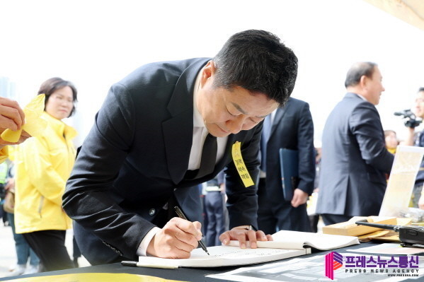▲16일 오후 안산 화랑유원지에서 열린 세월호참사 11주기 기억식에서 김진경 경기도의회 의장이 방명록을 작성하고 있다.(사진=경기도의회) |