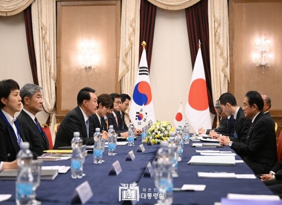 | ▲ NATO 정상회의 참석차 리투아니아를 방문 중인 윤 대통령이 12일(현지시간) 빌뉴스 한 호텔에서 열린 한일 정상회담에서 발언하고 있다. (사진=대통령실) |