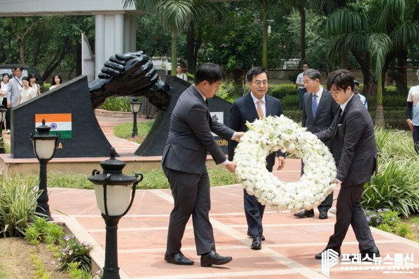 ▲ 현지시간 2일 오전 김동연 경기도지사가 한국-인도 우호공원을 방문하여 헌화 및 참배를 하고 있다. (사진=경기도) |