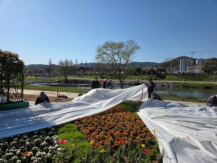 특히 꽃강길 일원에 식재된 초화류는 저온과 외부 환경 변화에 매우 민감해 일시적인 기온 저하에도 생육 저하나 꽃잎 손상으로 이어질 수 있어, 군은 서리 피해가 우려되는 주요 구간을 중심으로 부직포를 활용한 보온·보호 조치를 신속히 시행했다.