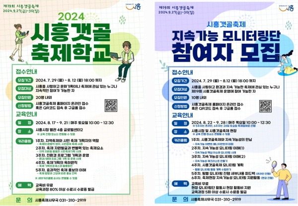 ‘갯골 축제학교’는 전문적인 축제기획자 양성을 위한 강의로 구성돼 축제 기획과 문화 콘텐츠에 대한 지식을 제공한다. 교육은 8월 17일부터 9월 21일까지 매주 토요일에 시흥시청 글로벌센터에서 진행되며, 교육비는 무료다.