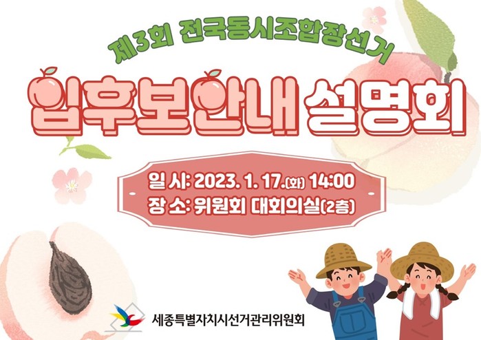 [프레스뉴스] 김교연 기자= 세종시선거관리위원회가 3월 8일 실시하는 제3회 전국 동시 조합장 선거를 앞두고 오는 17일 오후 2시부터 2층 대회의실에서 입후보 안내 설명회를 개최한다고 11일 밝혔다.