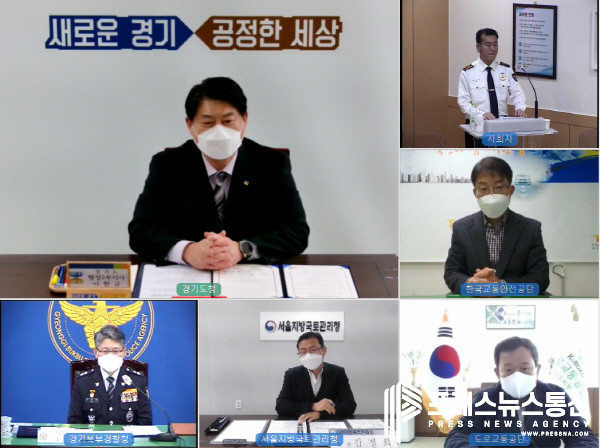 이날 협약식은 코로나19 상황을 고려해 비대면 화상회의 방식으로 진행됐으며, 이한규 경기도 행정2부지사, 김남현 경기도북부경찰청장, 김정희 서울지방국토관리청장, 송준규 도로교통공단 경기도지부장, 정관목 한국교통안전공단 경기북부본부장 5개 기관 대표가 서명자로 참여했다.