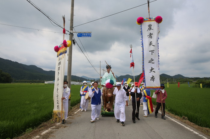 한편 9시부터는 식전 행사로 깃발을 앞세운 마을 농악대의 동네 한 바퀴 길놀이가 펼쳐지는데, 여기에는 출향인과 마을주민들이 직접 참여하여 단합된 모습을 보여준다.