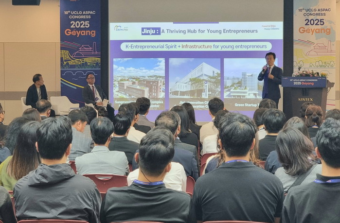 진주시에 따르면 조 시장은 24일부터 26일까지 킨텍스에서 열리고 있는 ‘2025 제10차 세계지방정부연합 아시아·태평양지부(UCLG ASPAC) 고양 총회’ 서브포럼에 공식 초청받아 25일 ‘청년 리더십’을 주제로 발표했다. 이번 총회는 ‘미래를 위한 지속가능한 글로벌 자족도시와 지역’을 메인 주제로 220개 지방정부, 약 500여 명이 참석했다.
