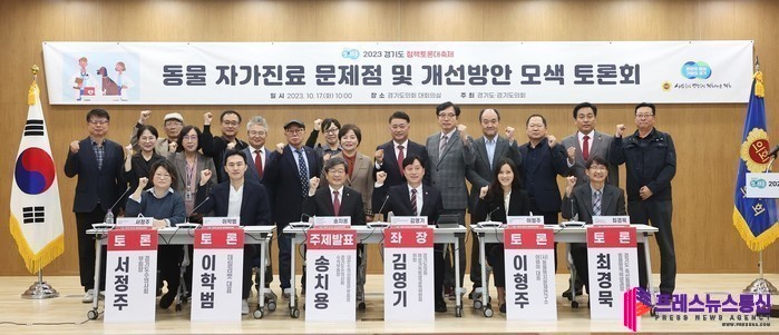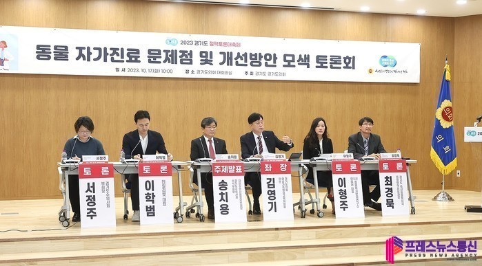 [프레스뉴스] 김대일 기자= 경기도의회 여성가족평생교육위원회 김영기(국민의힘, 의왕1) 의원이 좌장을 맡은 「동물 자가진료 문제점 및 개선방안 모색 토론회」가 10월 17일(화) 오전 경기도의회 대회의실에서 열렸다. 이번 토론회는 경기도와 경기도의회가 공동으로 주최하는 ‘2023 경기도-경기도의회 정책토론 대축제’의 일환으로 개최됐다.