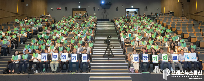 | ▲ 16일 오후 경기도청 대강당에서 열린 RE100 플랫폼 구축 포럼에서 김동연 경기도지사, 강금실 경기도 기후대사 등이 카드 퍼포먼스 및 기념촬영을 하고 있다.(사진=경기도) |