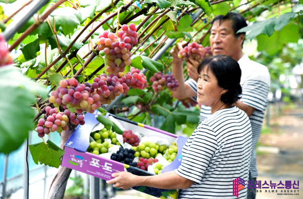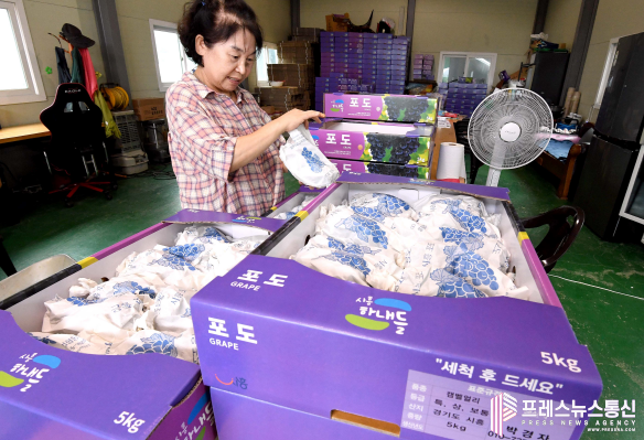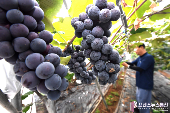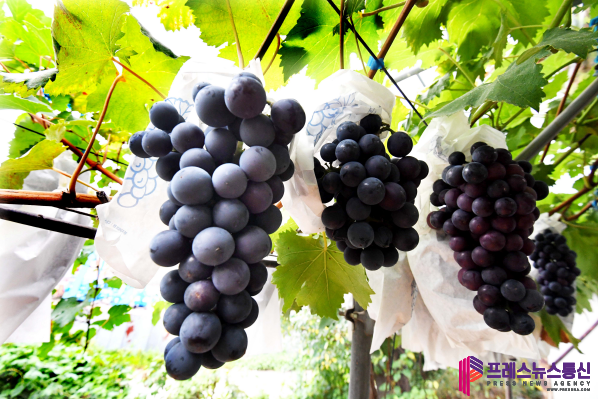 [프레스뉴스] 장현준 기자= 추석을 앞두고 경기도 시흥시 방산동, 논곡동 일대의 포도 농장에서는 포도 수확에 한창이다. 포동포동하게 잘 익은 포도송이들이 탐스럽게 열려있는 포도밭에서 구슬땀을 흘리는 농민들의 손길이 분주하다.