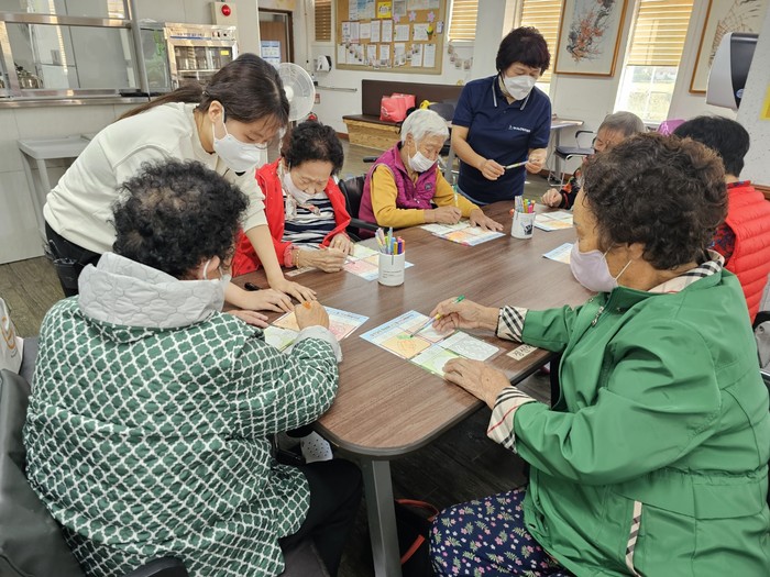 | ▲주간보호센터 이용 어르신들이 치매예방 프로그램에 참여하고 있다.(사진제공=화순군) |