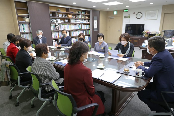 ▲16일, 본청 3층 집무실에서 최교진 교육감과 대표 유치원장들이 정책간담회에서 세종미래학교에 대해 논의하고 있다.(사진=세종시교육청) |
