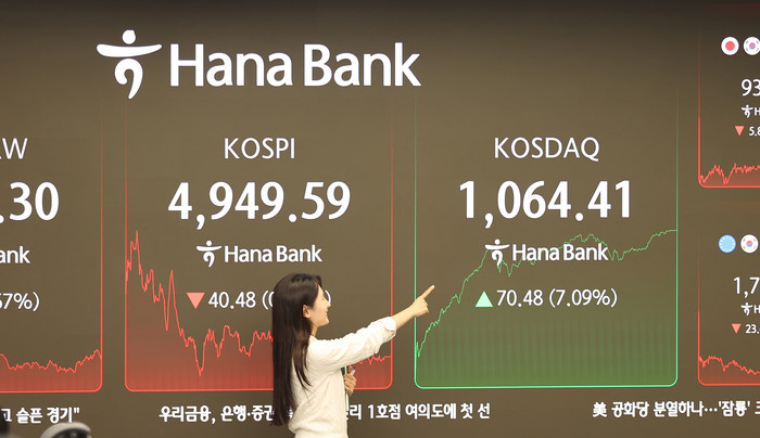 코스닥 지수가 장중 7% 넘게 급등하며 닷컴버블 이후 사상 최고치를 돌파한 26일 오후 서울 중구 하나은행 딜링룸 전광판에 코스닥 종가가 나오고 있다.