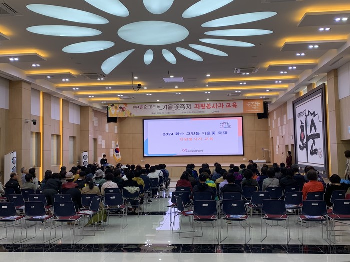 [전남=프레스뉴스] 박정철 기자= 화순군(군수 구복규)은 '2024 화순 고인돌 가을꽃 축제(이하 가을꽃 축제)의 성공적인 개최를 위하여 140여 명의 자원봉사자들을 대상으로 지난 14일 군청 대회의실에서 자원봉사자 교육을 진행했다.