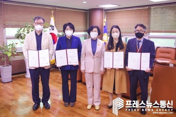 ▲안산시의회가 13일 의장실에서 ‘2021 회계연도 안산시 결산검사 위원 위촉식’을 가졌다. 사진 왼쪽부터 윤성호 위원, 김진숙 대표위원, 박은경 의장, 이은정 위원, 조동근 위원의 모습.(사진=안산시의회) |