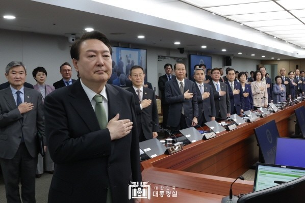 | ▲윤석열 대통령이 2일 서울 용산 대통령실 청사에서 열린 국무회의에서 국기에 경례하고 있다.(사진=대통령실) |