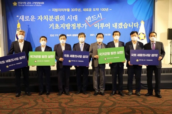 ▲ 전국시장군수구청장협의회는 오늘(29일) 오후 민선7기 3차년도 제4차 공동회장단회의를 개최하고 세종 국회의사당 설치를 촉구하는 입장문을 발표하였다.(사진=전국시장군수구청장협의회) |