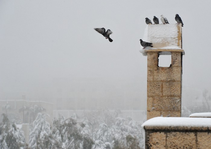 [프레스뉴스] 채정병 특파원=27일(현지시간) 비둘기 무리가 눈세상이 된 마을을 내려다보고 있다. 터키를 휩쓴 강력한 눈구름의 영향으로 요르단 수도 암만을 비롯한 전국의 고산지대에 26일 밤부터 강풍을 동반한 폭설이 계속돼, 도로 곳곳이 폐쇄되고 정전사태가 속출했다. 지역에 따라 최대 30센티미터 이상을 기록중이며 기온도 0도, 체감온도 -9도까지 떨어졌다. 정부는 임시공휴일을 선포하고 비상상황에 대처하고 있다.