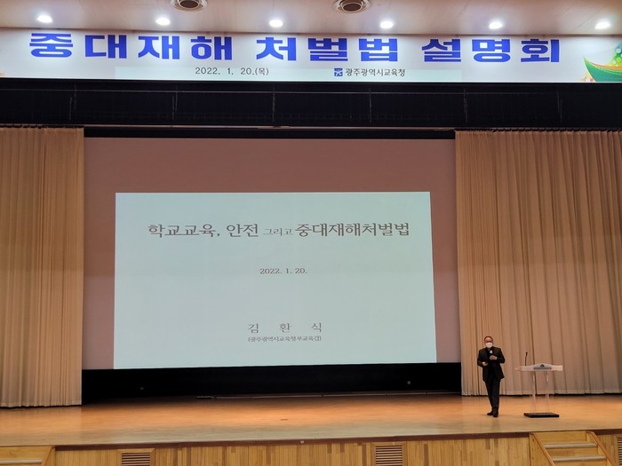 [광주=프레스뉴스] 강래성 기자= 광주시교육청이 20일 광주광역시교육연수원 대강당에서 전체 공·사립학교 교장들을 대상으로 ‘중대재해 처벌 등에 관한 법률(이하 중대재해처벌법)’ 관련 설명회를 개최했다.