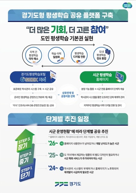 경기도는 2024년 상반기까지 현재 도가 운영 중인 ‘평생학습포털 지식(GSEEK)’을 표준화된 ‘경기도형 평생학습 공유플랫폼’으로 개편할 방침이다. 공유플랫폼은 ▲표준화된 학사관리 시스템 ▲도민 학습 이력 통합 ▲온라인 및 실시간 화상교육 확대 ▲도-시군 통합 온라인, 오프라인, 실시간 평생학습 등 4가지 서비스를 제공해 시군별로 활용할 수 있다.