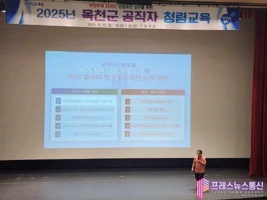 [프레스뉴스] 류현주 기자= 옥천군은 15일 옥천문화예술회관에서 군 산하 전 직원대상으로 2회에 걸쳐 청렴한 공직사회 정착을 위한 반부패 청렴교육을 진행했다. 교육은 청렴한 공직사회의 정착을 위한 일환으로 마련되었으며 직원들의 올바른 공직관 확립과 청렴 의식 제고에 중점을 두었다.