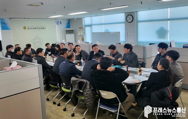 [프레스뉴스] 김대일 기자= 더불어민주당 안산지역 김동규 도의원(안산시1, 보건복지위), 김태희 도의원(안산시2, 경제노동위), 장윤정 도의원(안산시3, 교육기획위), 정승현 도의원(안산시4, 기획재정위), 강태형 도의원(안산시5, 농정해양위), 이기환 도의원(안산시6, 안전행정위), 김철진 도의원(안산시7, 문화체육관광위)은 2일 경기도의회 안산상담소에서 전국택시노동조합연맹 관계자 및 택시회사 관계자 11명, 경기도청 택시교통과장 등이 참석한 가운데 경기도 택시요금 조정 정책 논의를 위한 택시노조 간담회를 가졌다.