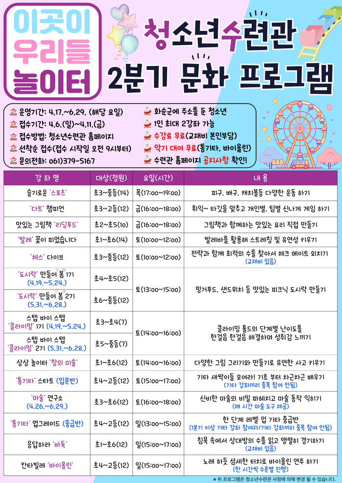기타 자세한 사항은 화순군청소년수련관 누리집을 참고하거나, 문화 프로그램 담당자(☎061-379-5167)에게 문의하면 된다.
