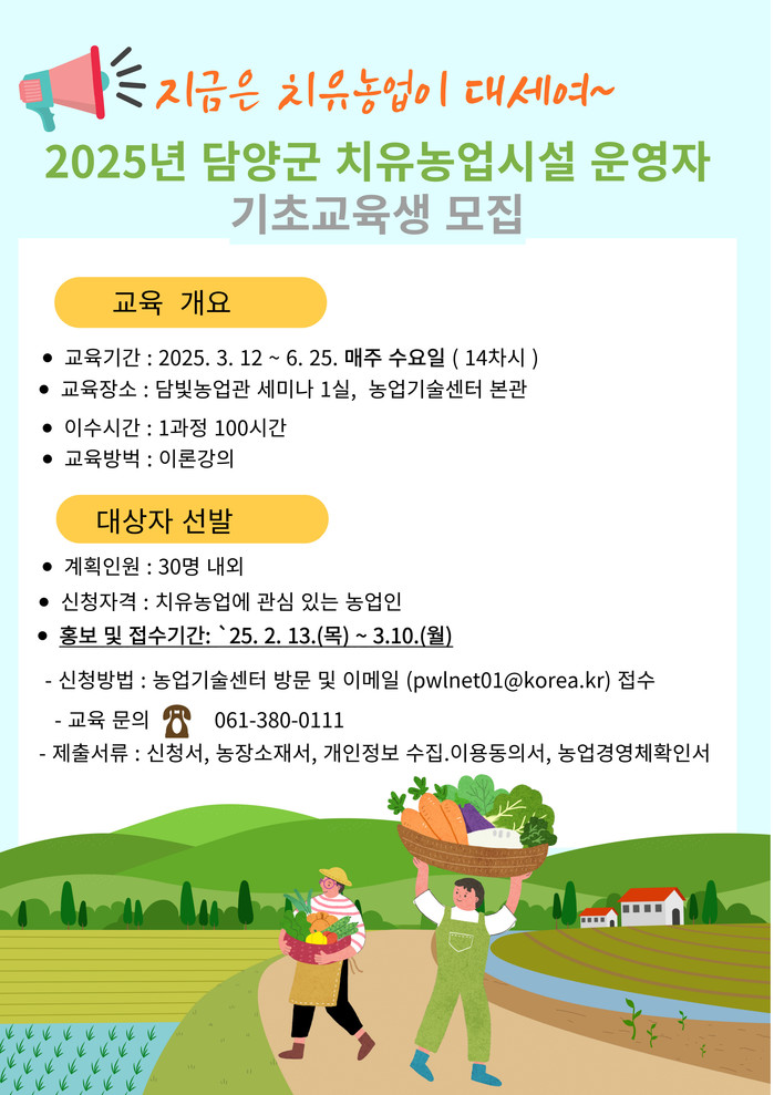 | ▲담양군, 치유농업 시설 운영자 기초교육생 모집 포스터(사진제공=담양군) |